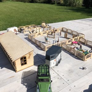 The stable has 8 boxes for your horses (eg. Schleich). Each box has a window. The roof is built in one piece and you can detach it to have a better access to your horses.