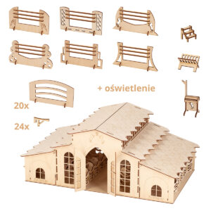 The set includes: Set XL Horse stable “SUŁTAN” for 24 stands + lighting + 20 fences + 24 saddle holders + 6 obstacles + feeder + ladder + stand for halter and saddle