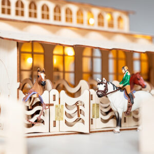 This beautiful SULTAN stable with lighting has as many as 24 positions for your wonderful horses. It consists of the main stable and two English stables that you can set up separately. Each box for your horse has a window and a door. The roof of the stable consists of six parts. Each part can be removed for easy access to your horses inside. The lighting of the stable gives a fabulous effect and serves as a night lamp. Large opening double doors lead to the stables. The stable has dimensions that match the classic and most traditional horse figurines, e.g. from Schleich Breyer Collecta Papo Bruder in 1:12 scale.